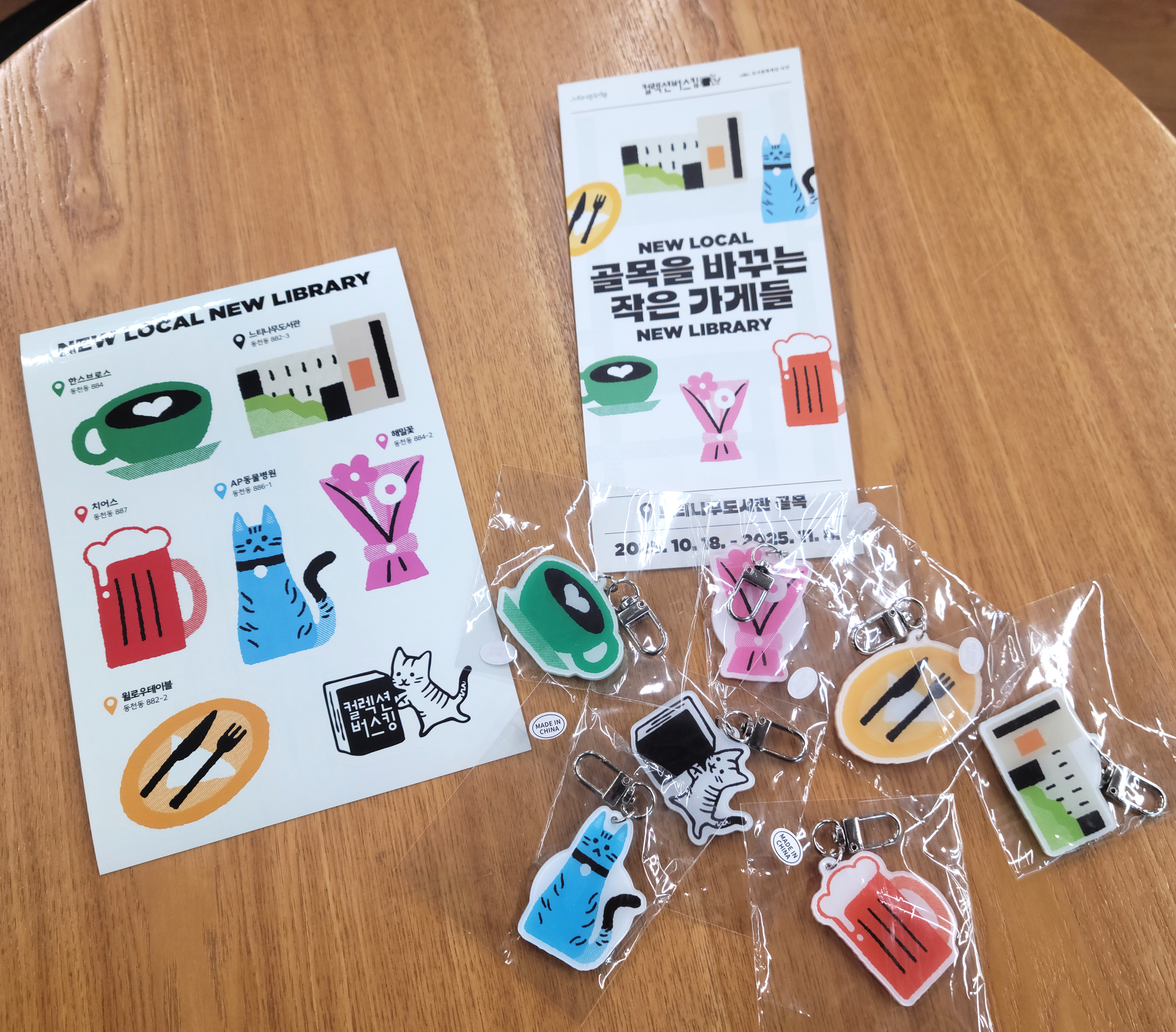 | 설명 | 느티나무 도서관 근처 5개 가게와 함께 한 컬렉션 버스킹 <골목을 바꾸는 작은 가게들> 브로슈어와 굿즈(스티커&열쇠고리). 스티커와 열쇠고리는 5개 가게-한스브로스(커피), 해밀꼿(꽃다발), 치어스(맥주), AP동물병원(고양이), 윌로우테이블(나이프&포크)-의 특징을 살려 디자인했다. 책을 밀고 있는 느티나무도서관 고양이 대섭씨와 도서관 외관을 단순하게 디자인한 굿즈까지! 각 가게에서 책을 빌리면 도서관에서 가게별 키링을 선물하는 이벤트도 진행. |