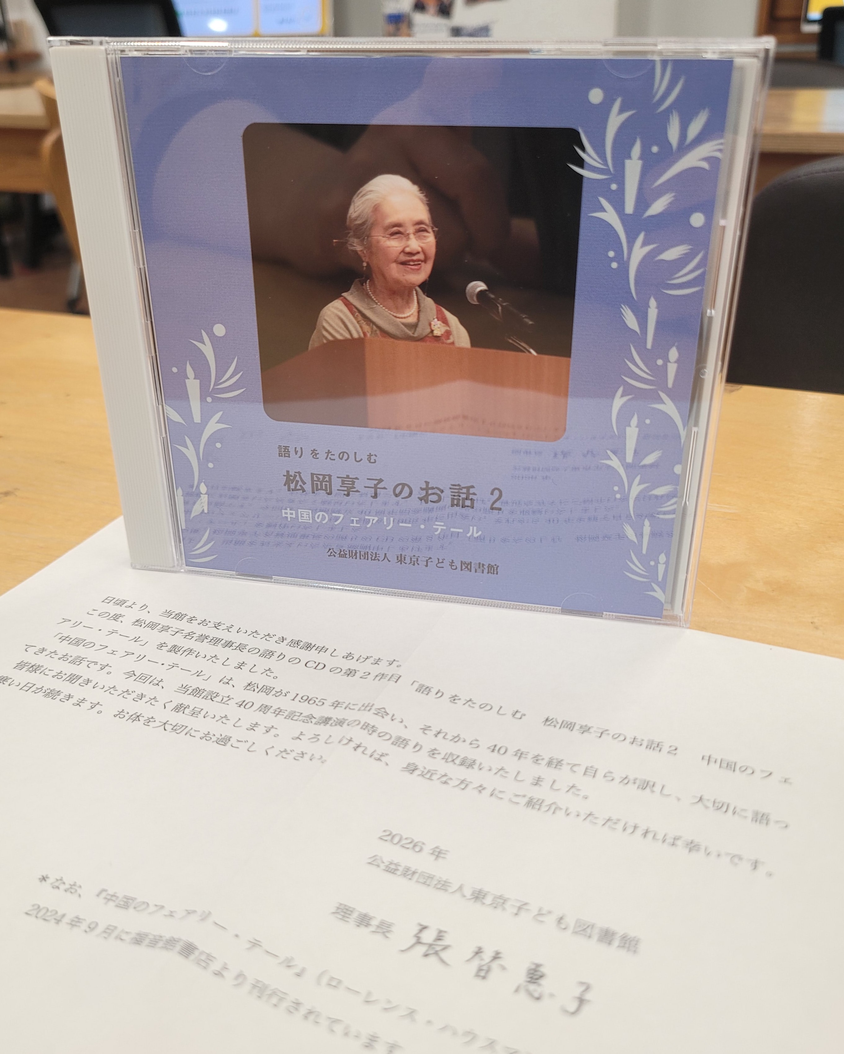 | 설명 | 마츠오카 쿄코 명예 이사장의 이야기 CD 두번째 작품. 도쿄 어린이 도서관 설립 40주년 기념 강연 때의 이야기를 녹음함. 도쿄 어린이 도서관에서 보낸 선물. |