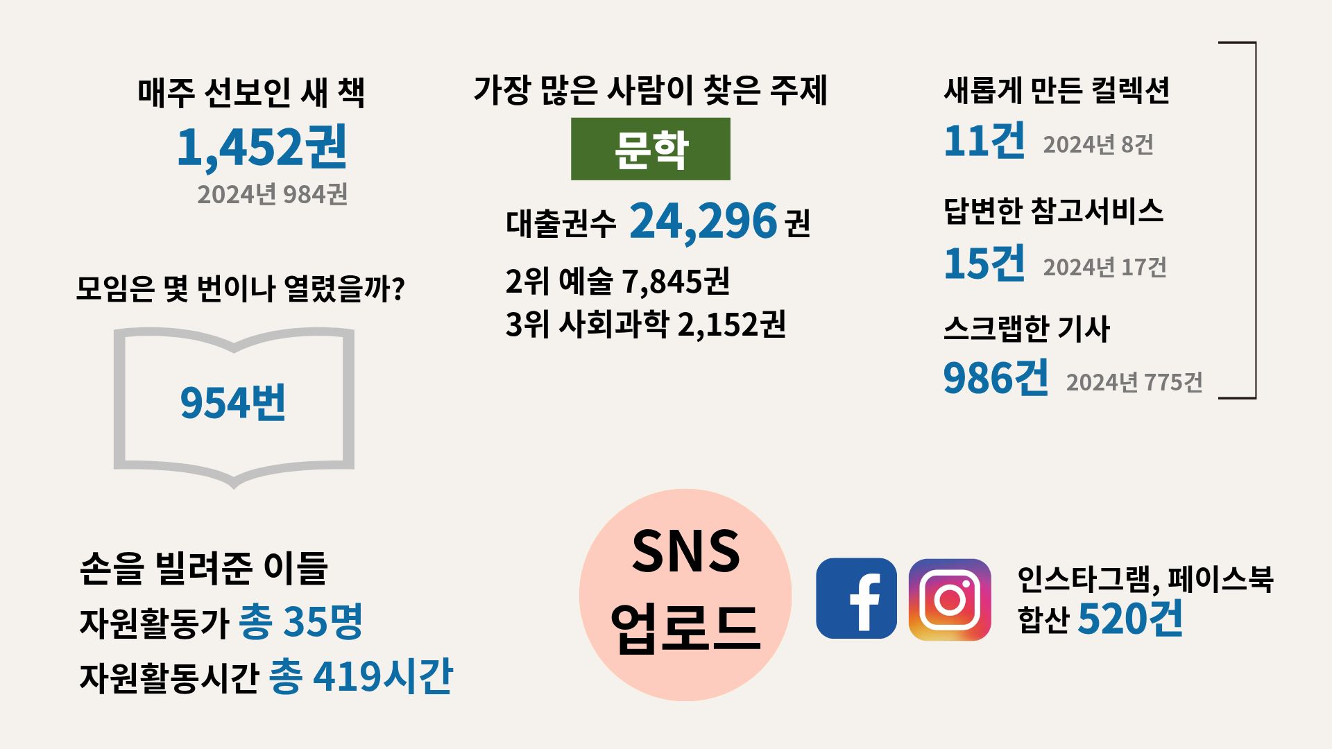 2025년, 느티나무도서관은 2024년(240일)보다 열흘 더 많은 250일 문을 열고 이웃들을 만났습니다.