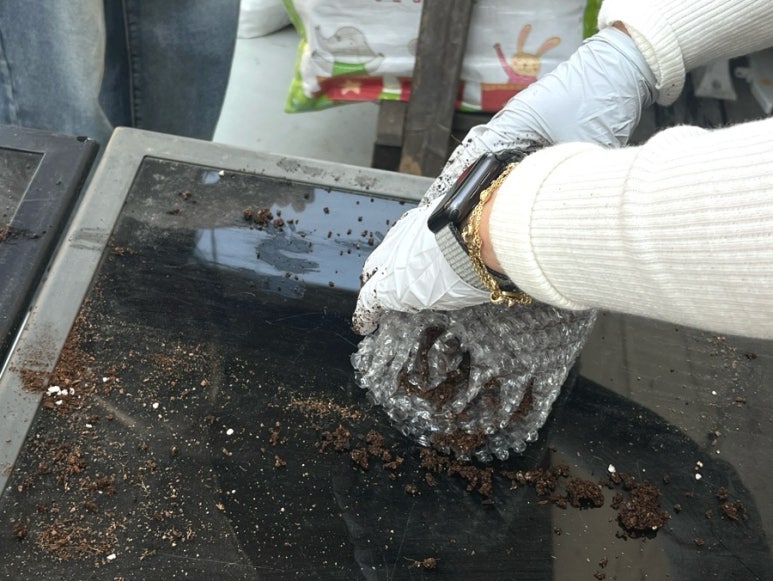 그리곤 흙을 뽁뽁이에 밥처럼 올리고,