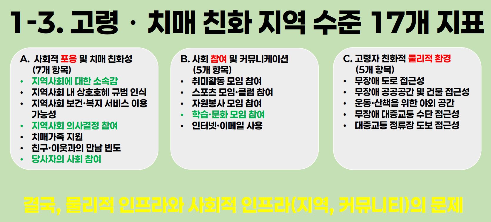 A,B,C로 나눠 설명하고 있는 [고령•치매 친화 지역 수준 17개 지표]를 토대로 물리적환경(C)의 개선은 국가의 영역이고, 참여&커뮤니케이션(B)은 지역단체의 영역임을 설명하면서 느티나무 도서관이 현재 활동하고 있는 것은 초록색 부분이라고 짚어주셨답니다.