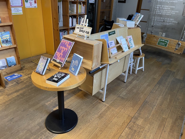 1층 카운터에서는 이용자를 만나고, 책을 빌리고 반납할 뿐만 아니라 매주 새로운 책들을 전시하고,