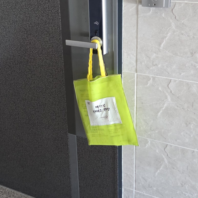 매주 직접 고른 책과 안부 편지를 가방에 넣어, 이웃집 문고리에 책가방을 걸어둡니다.
