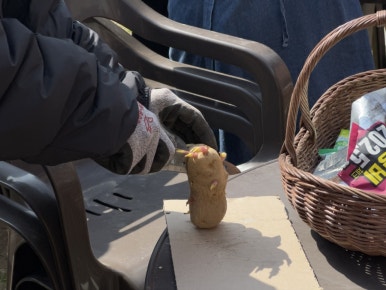 줄기(감자싹)가 고르게 나뉠 수 있는 방향으로 씨감자를 자르고,