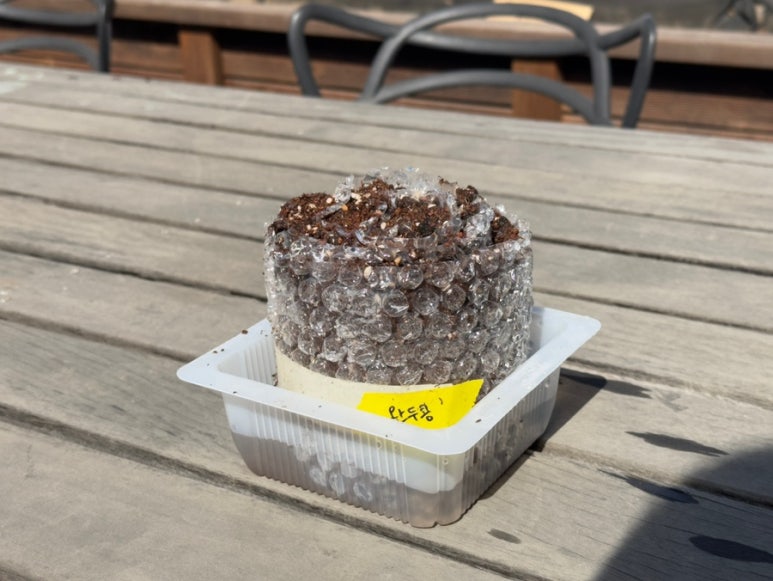 그리곤 흙을 뽁뽁이에 밥처럼 올리고,