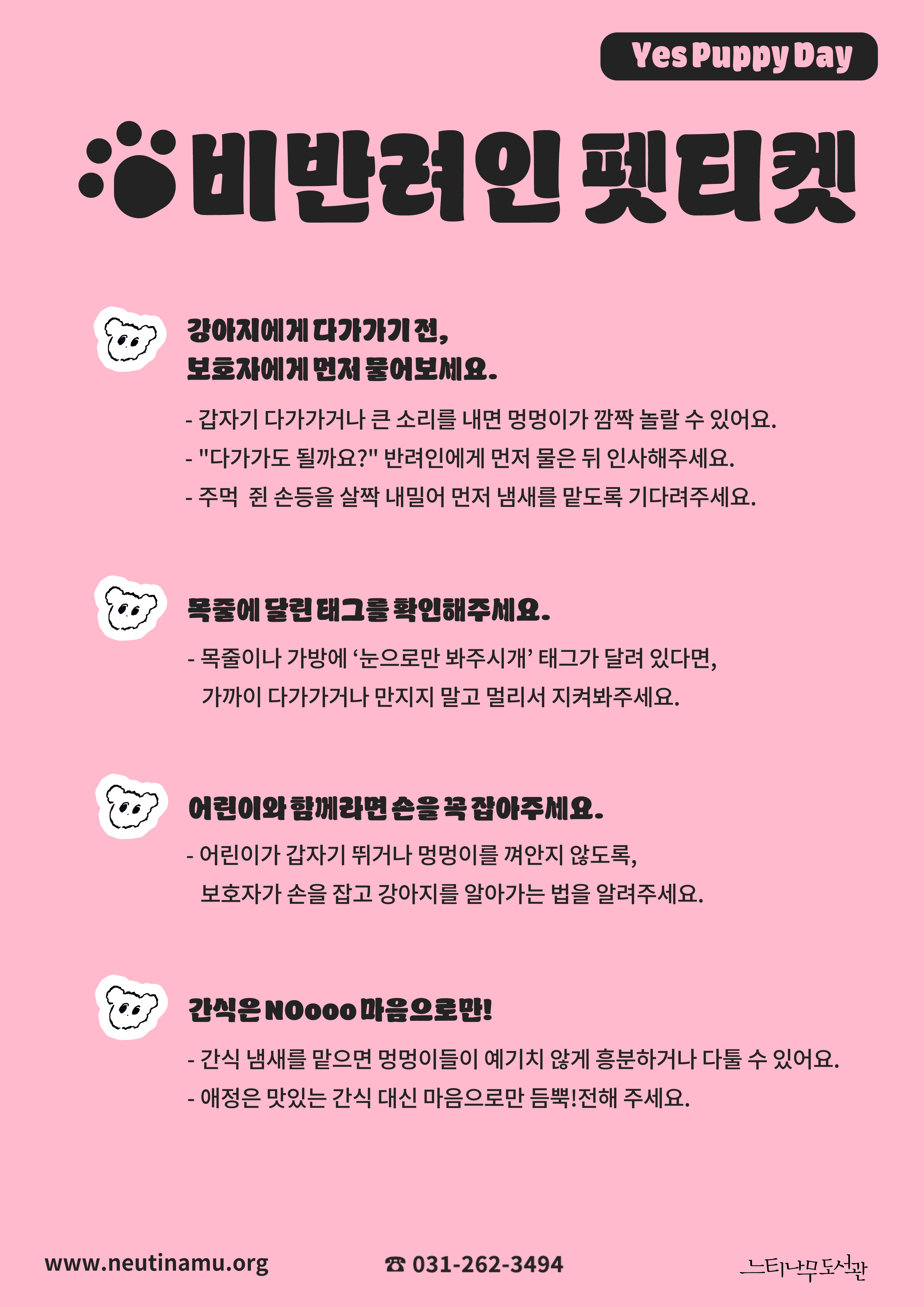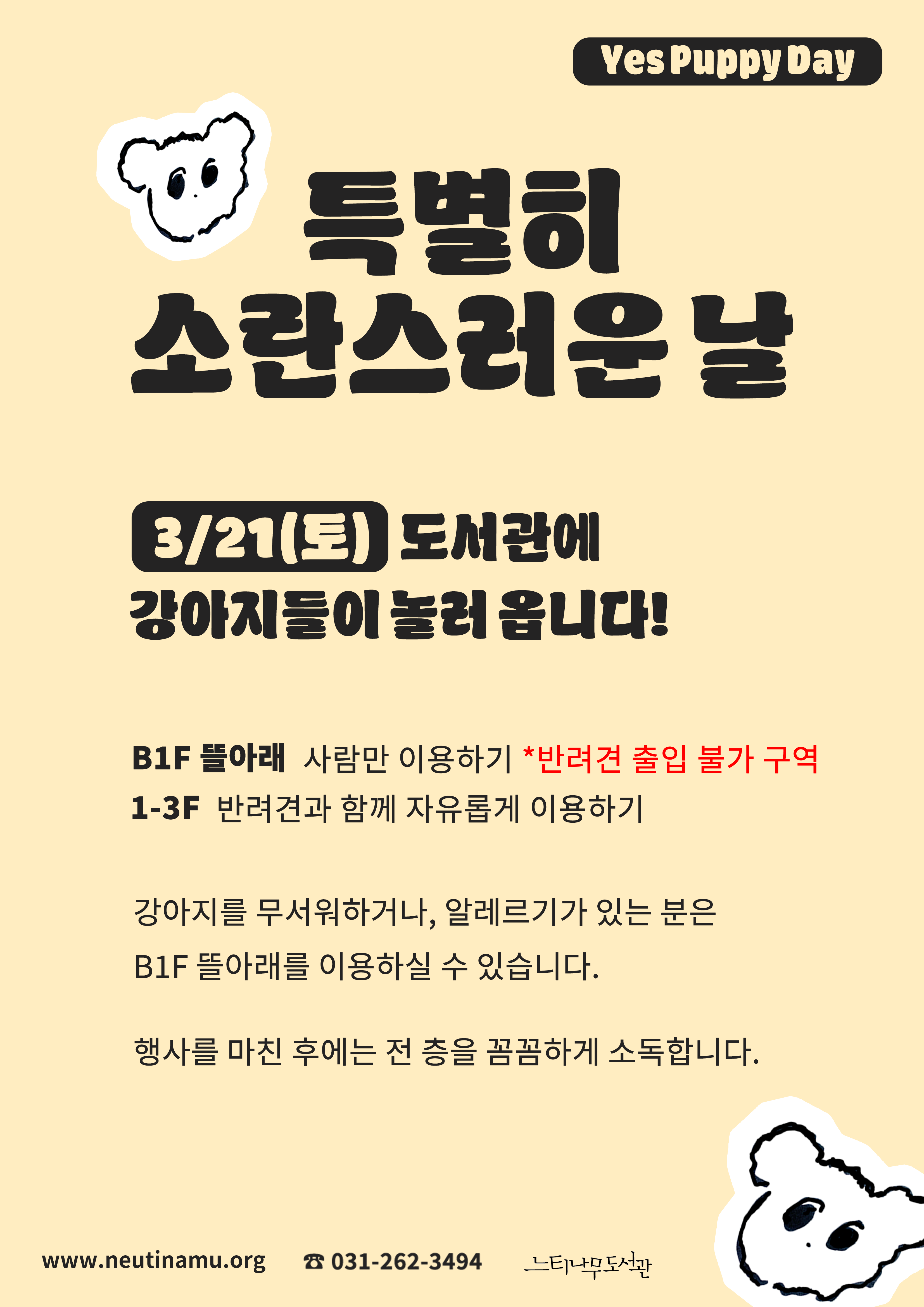 * 함께 만드는 도서관 문화 ·우리집 강아지의 성향, 함께 올 사람의 알러지 여부를 고려해 도서관 방문을 결정해주세요. ·행사 당일 반려견은 1-3층까지 이용 가능합니다. ·알러지가 있거나 반려견과 분리된 공간 이용을 원하는 분들은 지하 뜰아래를 찾아 주세요.