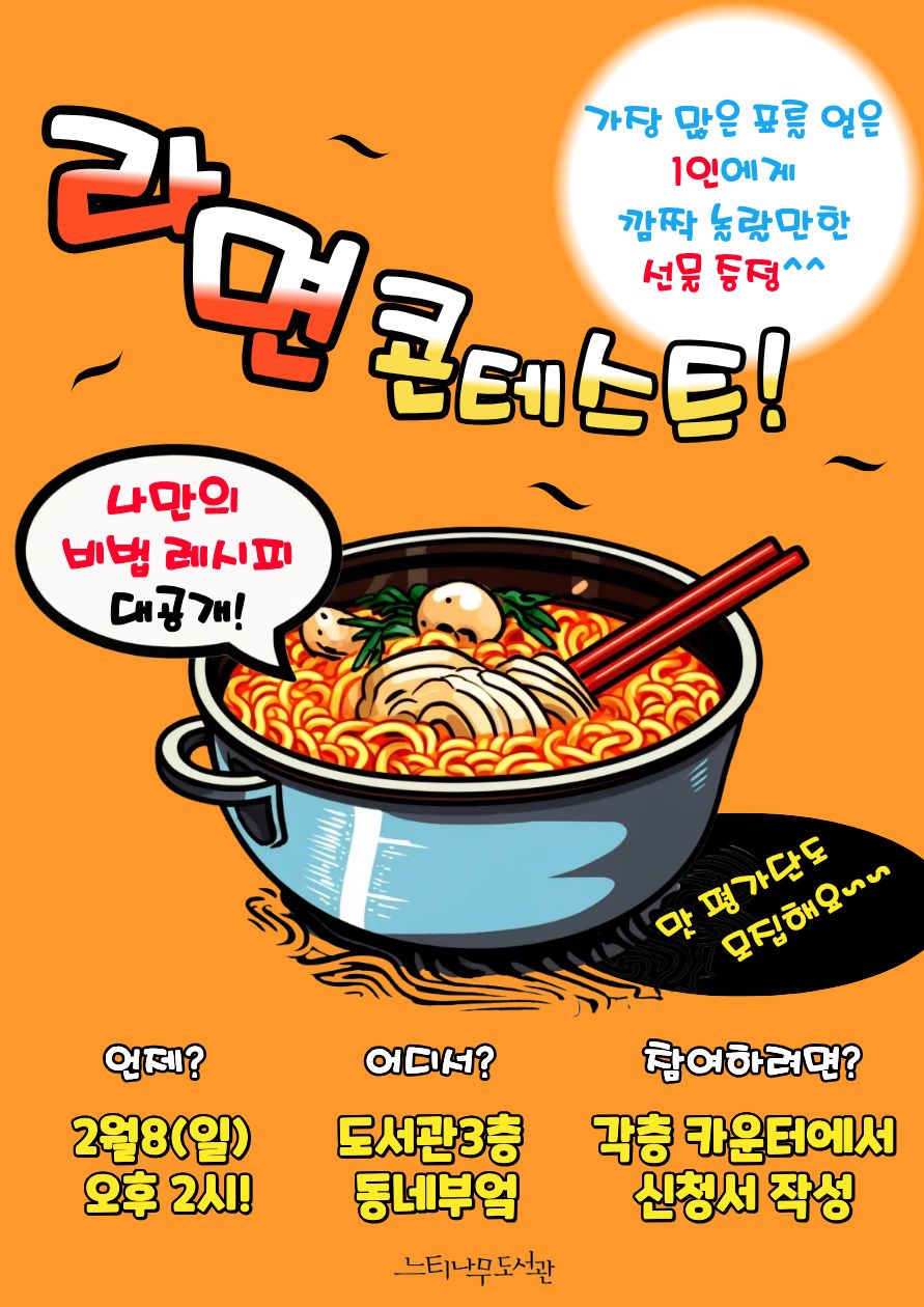 2월 8일(일) 오후 2시! 도서관 3층 동네부엌에서 라면 콘테스트가 열립니다. 나만의 라면 비법 레시피가 있다면? 도서관 각층 카운터에서 바로 신청하세요! (* 팀으로도 신청 가능해요~~) 탁월한 미각을 가지신 분들은 "맛평가단"으로 신청하세요.