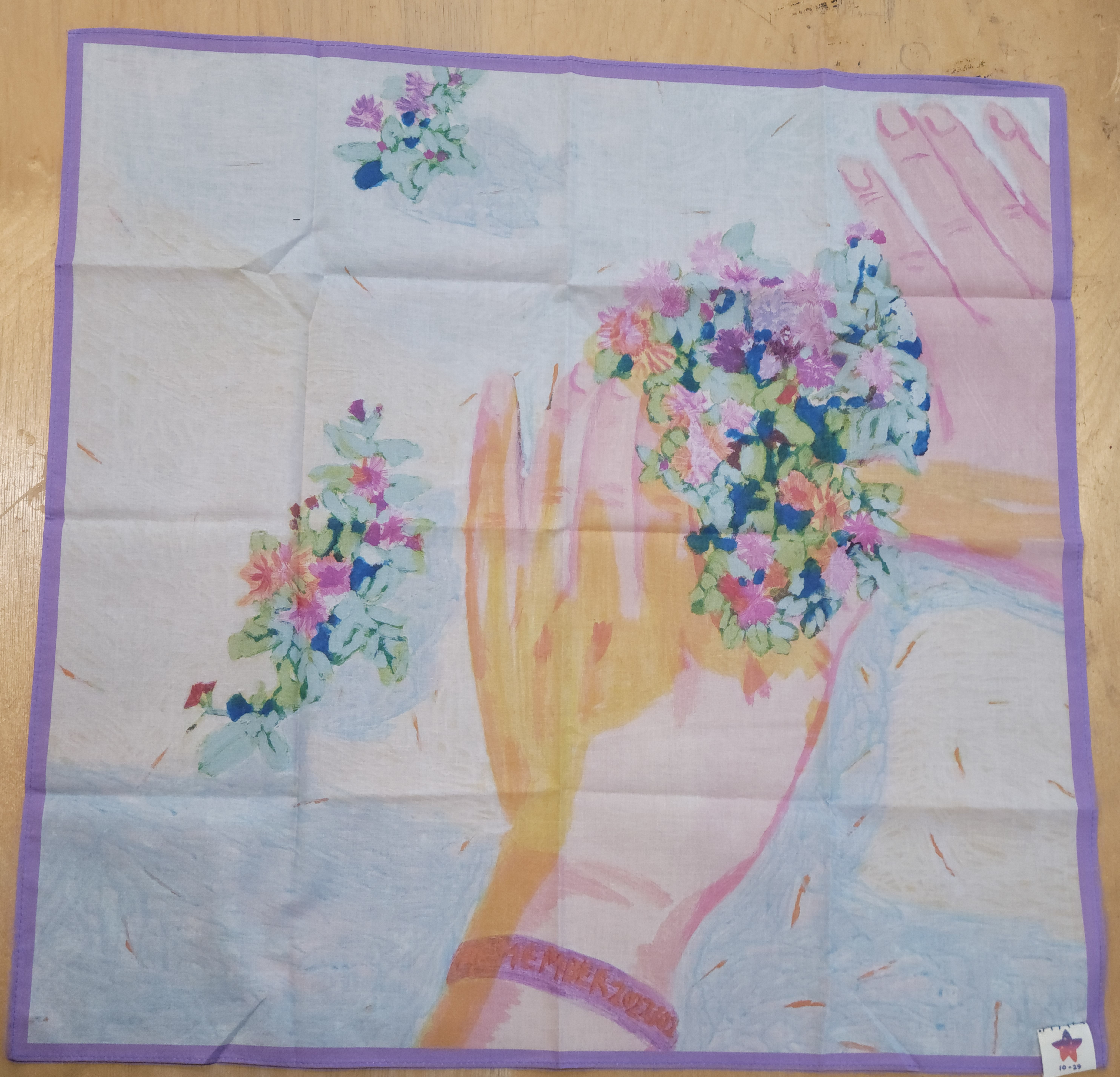 | 설명 | 10월17일 느티나무도서관에서 진행된 글로벌도넛데이 행사 중 하나였던 북토크 <아로새기다>. 책의 저자 김남희 님이 기증한 손수건.(김남희 님은 이태원 참사로 딸 신애진 님을 잃었다.) 기억소통공간 별들의 집에서 시민들과 함께 만든 손수건으로 전진경 작가의 그림을 프린팅했고, 시민들이 리본을 직접 손바느질하여 달았다. |