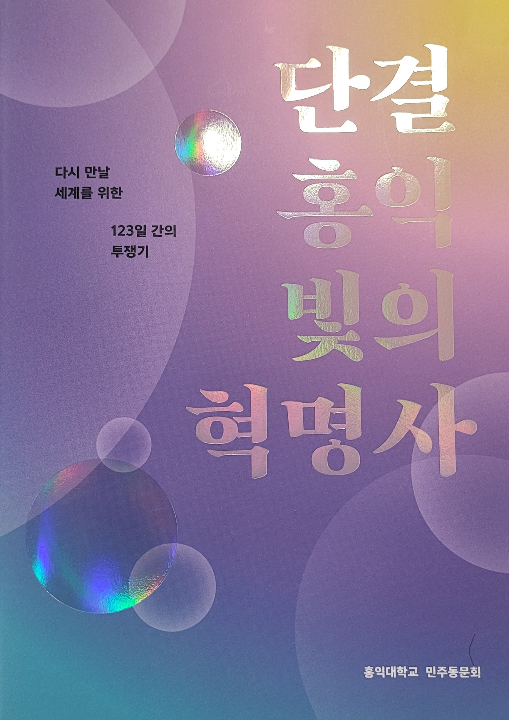 | 설명 | 2024년 12월3일 계엄령 포고일부터 2025년 4월4일 윤석열 대통령 탄핵까지 홍익대학교 민주동문회 선후배들과 홍익대학교 재학생들이 함께 한 거리에서의 경험과 기억을 담은 백서. |
