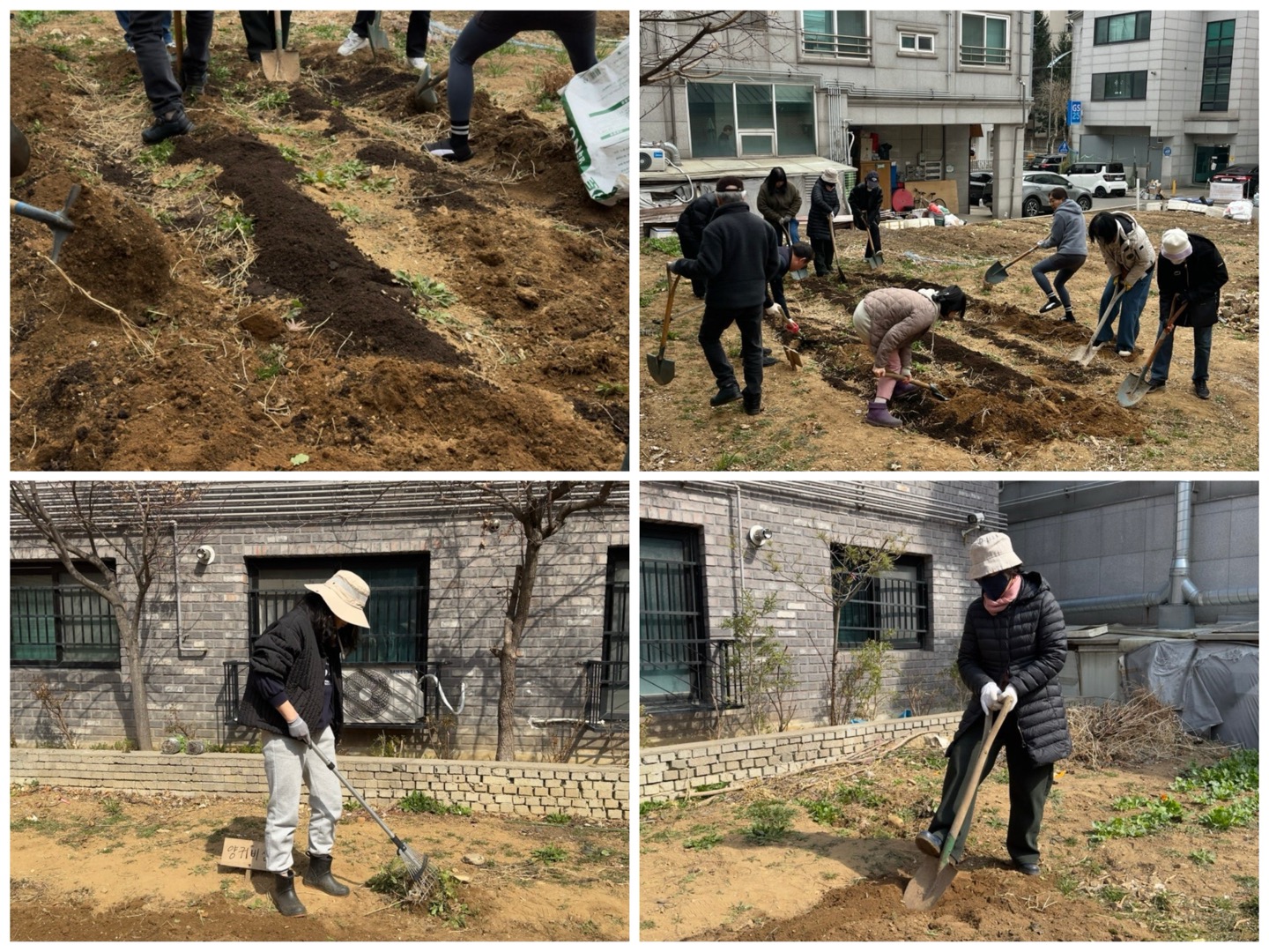 퇴비를 섞어 뿌리고, 흙을 열심히 뒤집었어요.