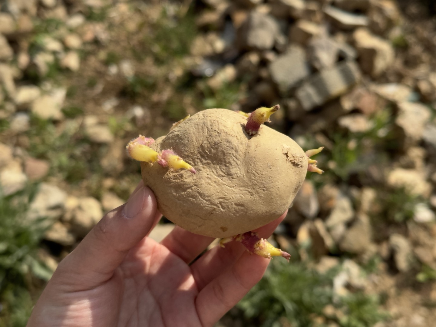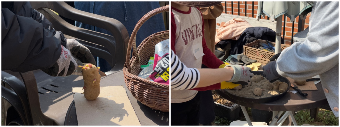 씨감자는 10cm 정도 깊게 파서, 줄기가 하늘을 바라보게 심어요.