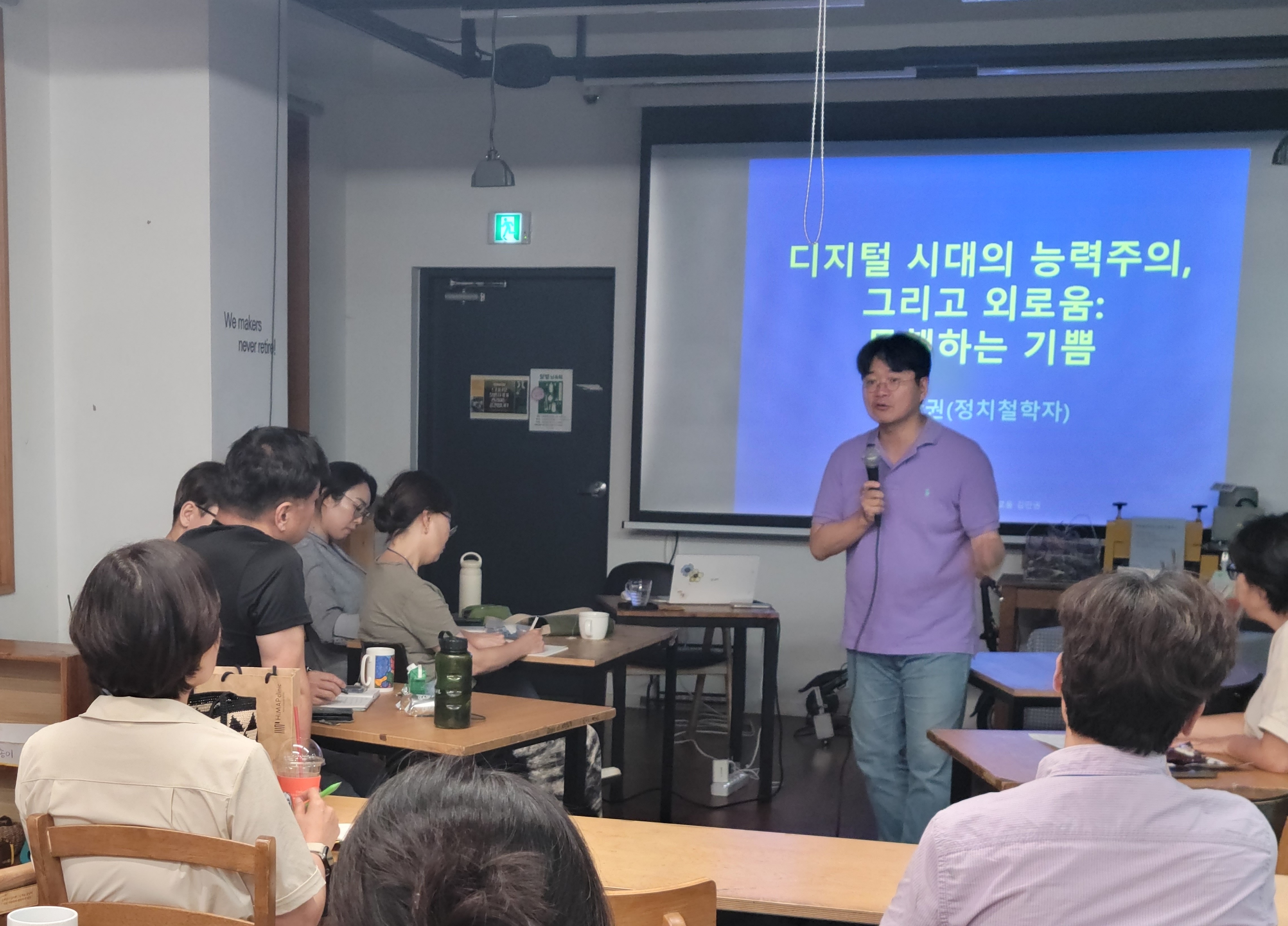 책 『외로움의 습격』 서문 낭독으로 시작된 돌봄 세션의 첫 강의는 이 책의 저자 김만권 경희대 비교문화연구소 연구교수의 <디지털 시대의 능력주의, 그리고 외로움 : 동행하는 기쁨>이라는 주제로 진행되었는데요. 대한민국 헌법에는 국가가 의무적으로 보호해야 될 대상을 ‘청소년, 신체장애자, 질병자, 노령자’로 규정하고 있는데, 이는 노동시장에서 경쟁력이 없는 국민만을 대상으로 하고 있고, 돌봄 비용을 제공하는 사람과 돌봄을 받는 사람을 갈라놓았으며, “돌봄을 하는 사람”에 대한 언급이 없다는 점을 강조했습니다.