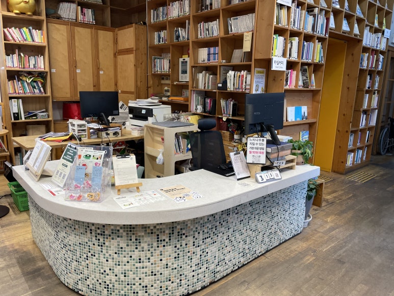 이 곳은 제가 느티나무도서관에서 가장 많은 시간을 보내고 있는 공간인 1층 카운터입니다.
