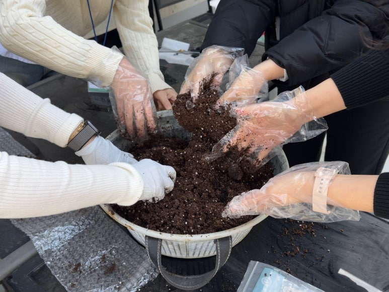 다 같이 상토와 비료를 조물조물 섞어 흙을 준비하는 모습이랍니다.
