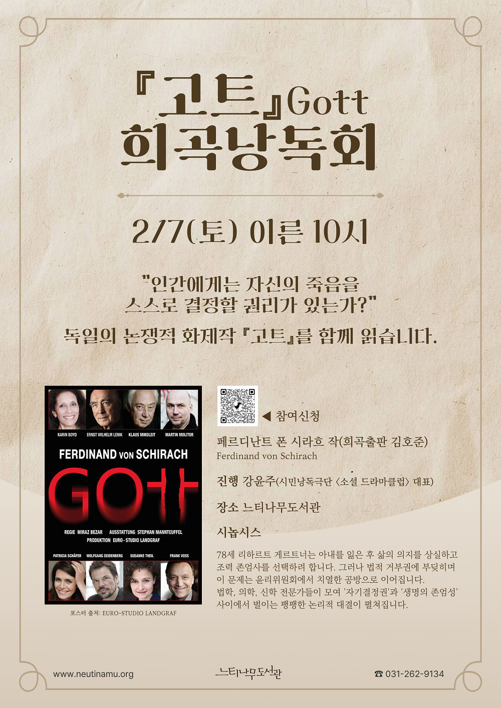 법학, 의학, 신학 전문가들이 모여 '자기결정권'과 '생명의 존엄성' 사이에서 벌이는 팽팽한 논리적 대결이 펼쳐집니다. 페르디난트 폰 시라흐 작(희곡출판 김호준)