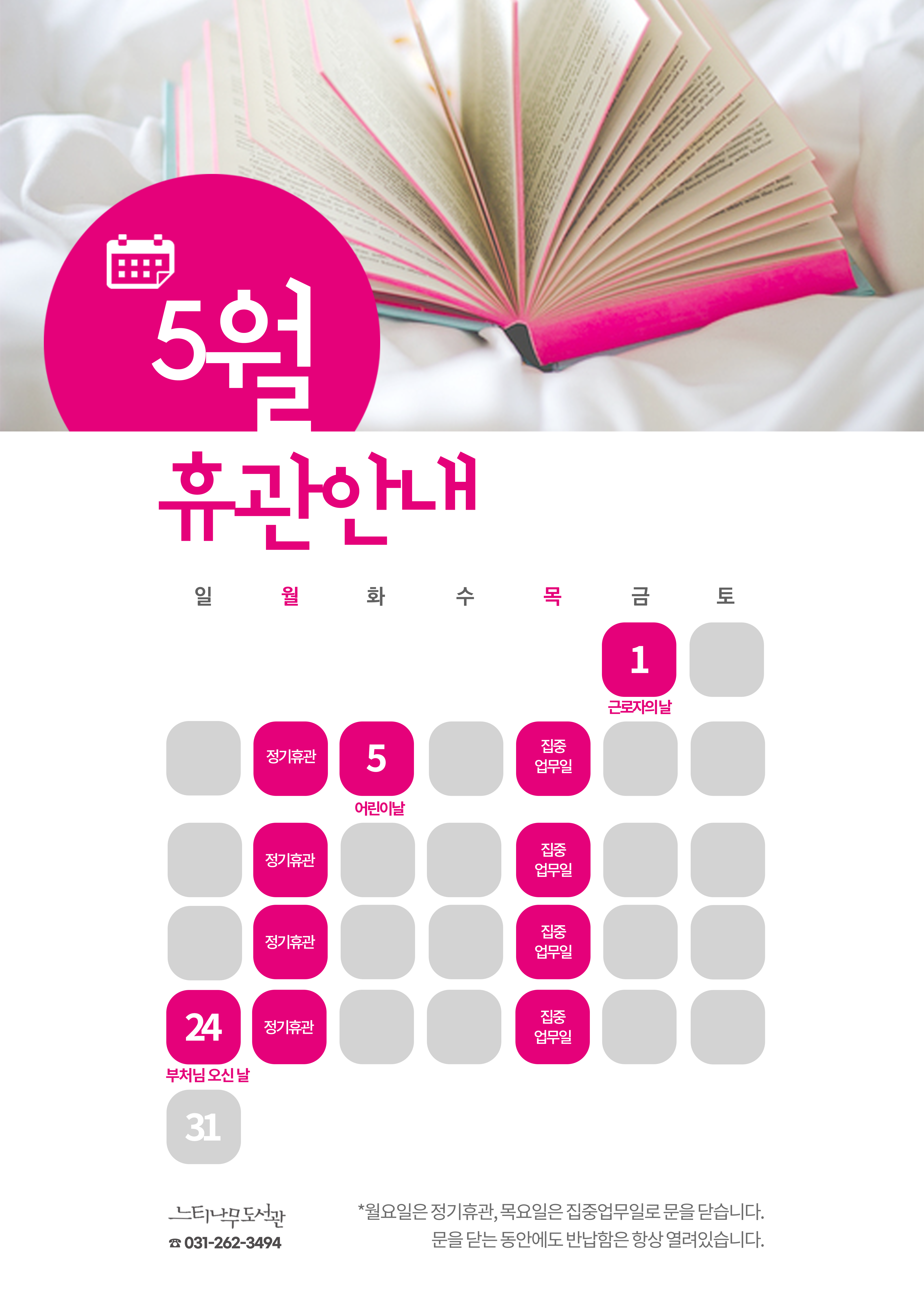 쉬는 날 : 1일(근로자의 날) / 5일(어린이날) / 24일(부처님 오신 날) 문 여는 날 : 화, 수, 금, 토 (이른 10시 ~ 늦은 9시), 일 (늦은 1시 ~ 늦은 6시) 문 닫는 날 : 월(정기휴관), 목(집중업무일) ※ 문을 닫는 동안에도 반납함은 항상 열려있습니다!