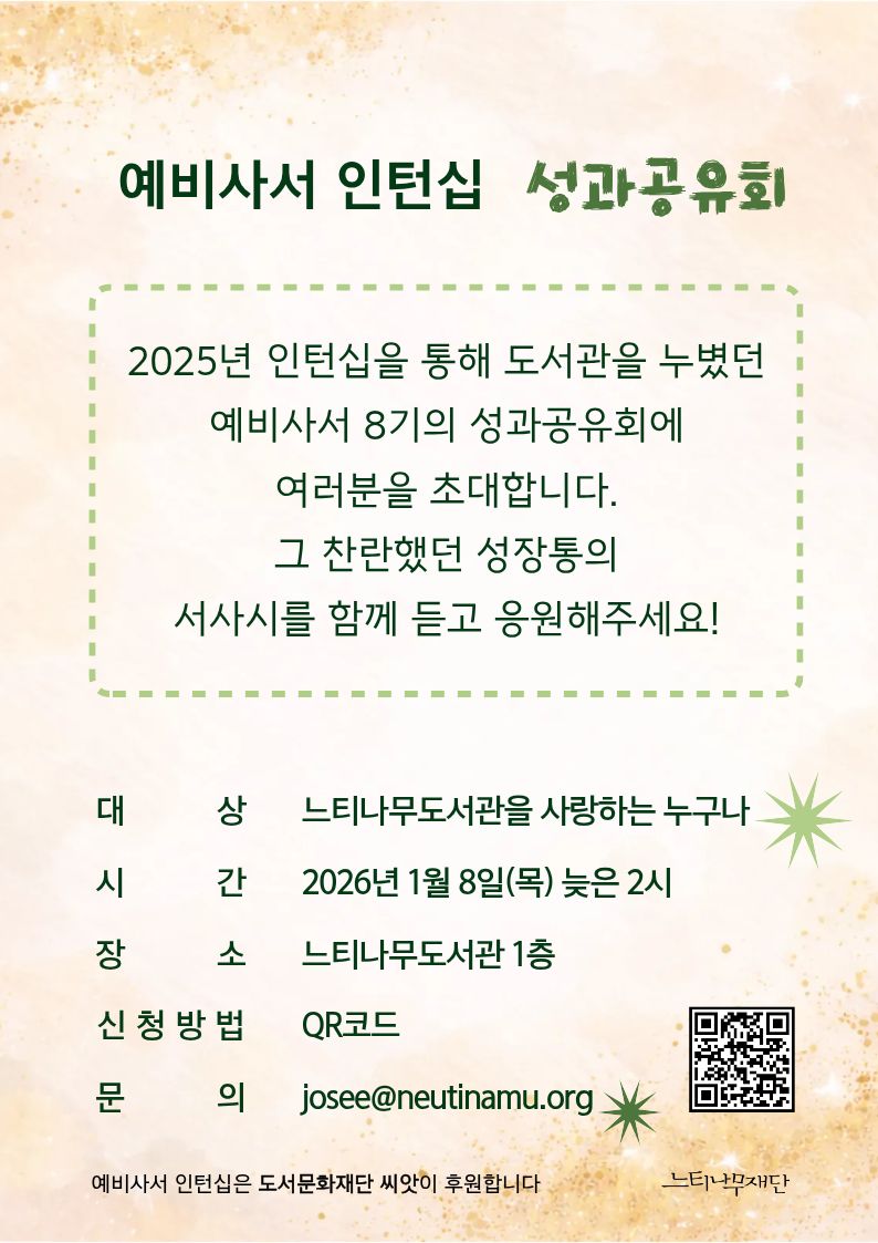 2025년 인턴십을 통해 도서관을 누볐던 예비사서 8기의 성과공유회에 여러분을 초대합니다.