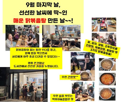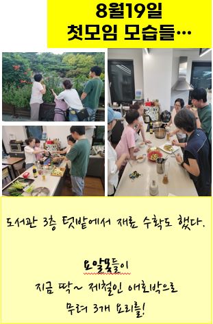 격주 화요일마다 도서관 3층 동네부엌에서는 맛있는 냄새가 진동합니다. 일명 <밥친구>라는 모임이 진행되기 때문인데요. 집밥 30년차 아줌마와 60년차 할머니가 가르쳐주는대로 따라했을뿐인데, 어느새 맛있는 한끼가 뚝딱~! 지난 8월부터 시작하여 이제 두 달이 되었습니다. 누구나 자신의 요리법을 전수해줄 수 있고, 누구나 배우며 함께 밥을 나눌 수 있답니다. 혼자 밥먹기 싫을 때, 도서관 3층으로 놀러오세요~! 다음 다섯번째 모임은 10월 14일(화) 입니다.