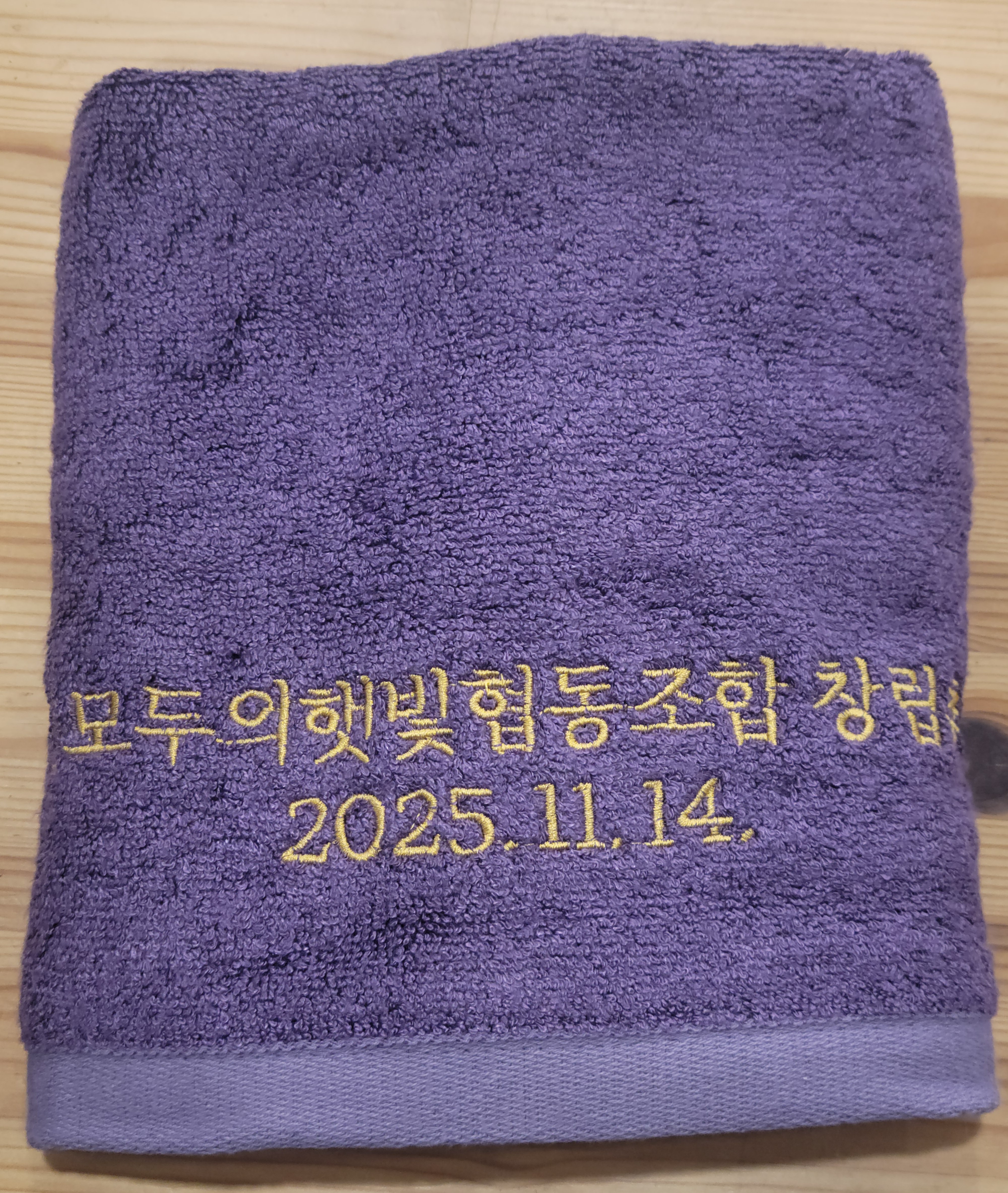 | 설명 | 2025년 11월 14일 진행된 용인모두의햇빛협동조합 창립총회 기념품 타월. 상자 안에 보관. |