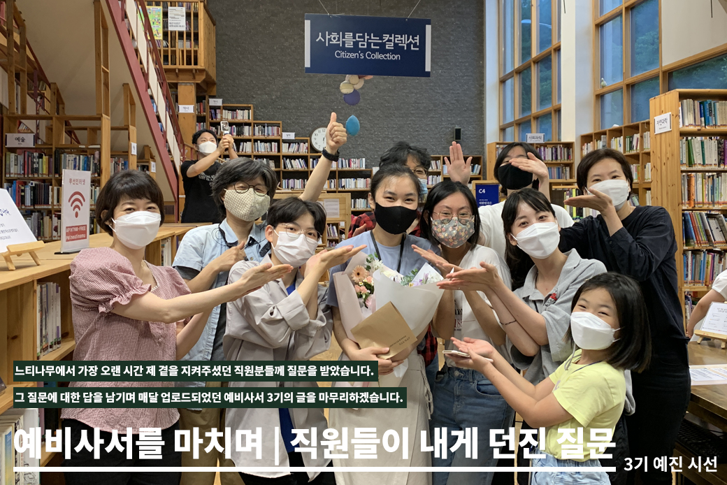 느티나무 직원들이 묻고 예비사서 3기 예진 님이 답하는 '예비사서를 마치며 | 직원들이 내게 던진 질문'까지.
