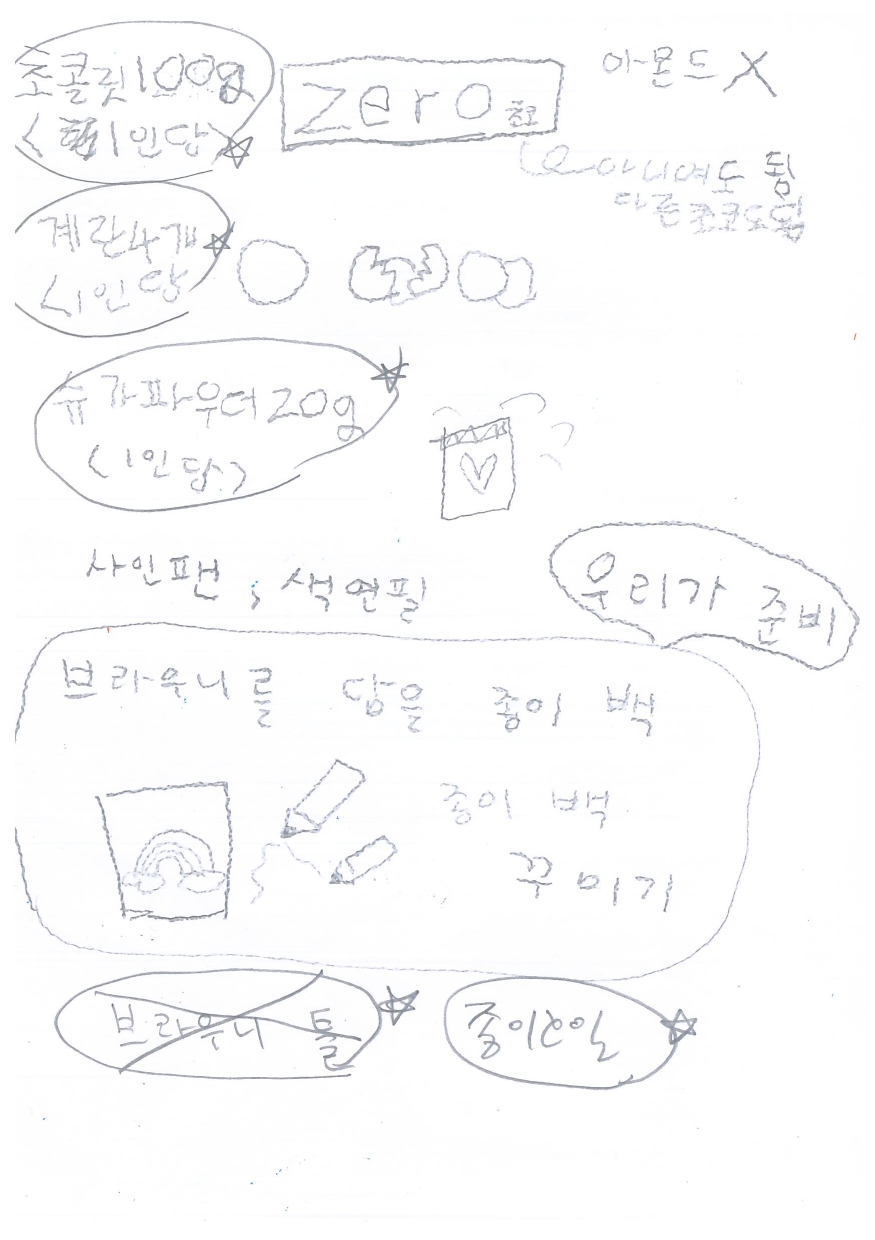 재료는 도서관에서 준비한다고 하니, 사서쌤에게 필요한 재료를 야무지게 적어줍니다.
