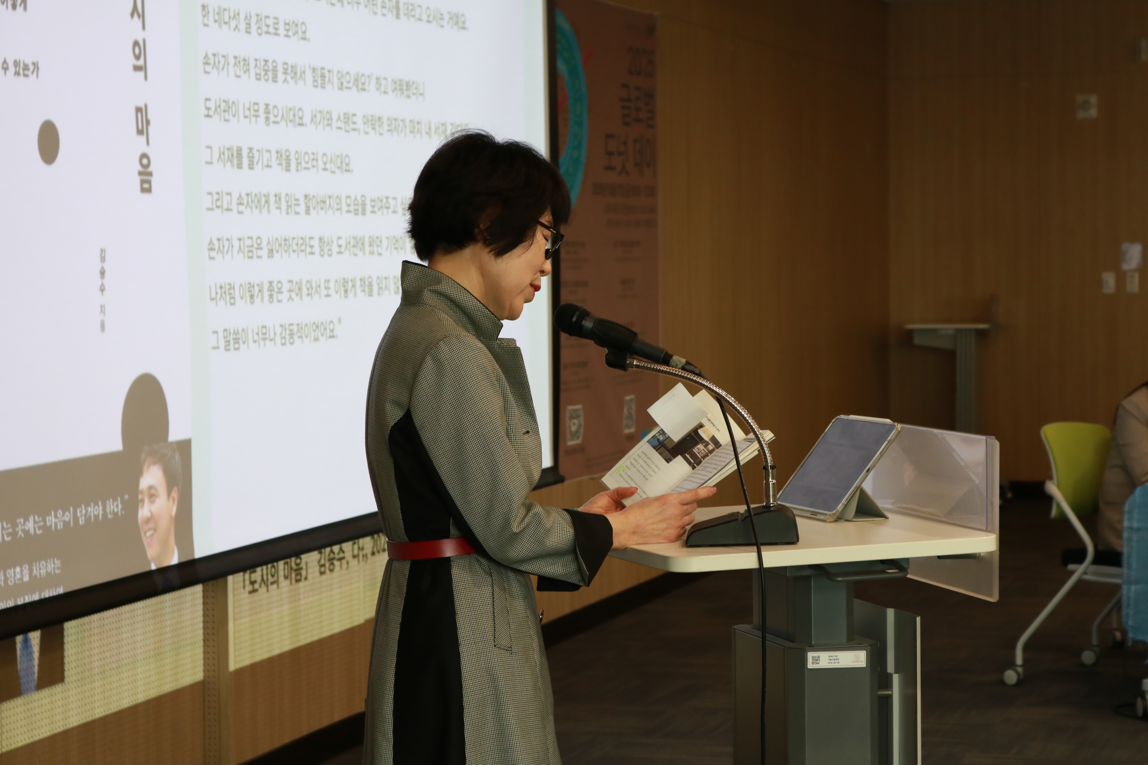 여느 때처럼 시니어살롱 희곡낭독회 구영숙 님의 낭독으로 '2025 전국도서관대회'를 시작했습니다.