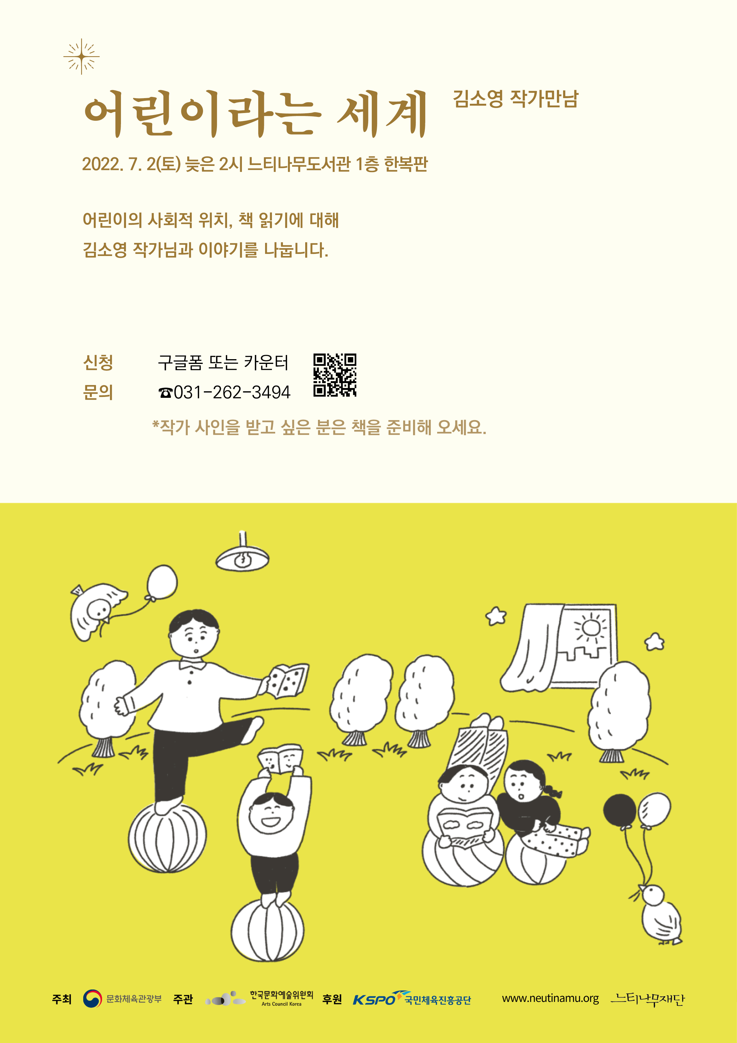 * 작가와의 만남 프로그램은 문화체육관광부 주최, 한국문화예술위원회 주관, 국민체육진흥공단이 후원으로 진행됩니다.