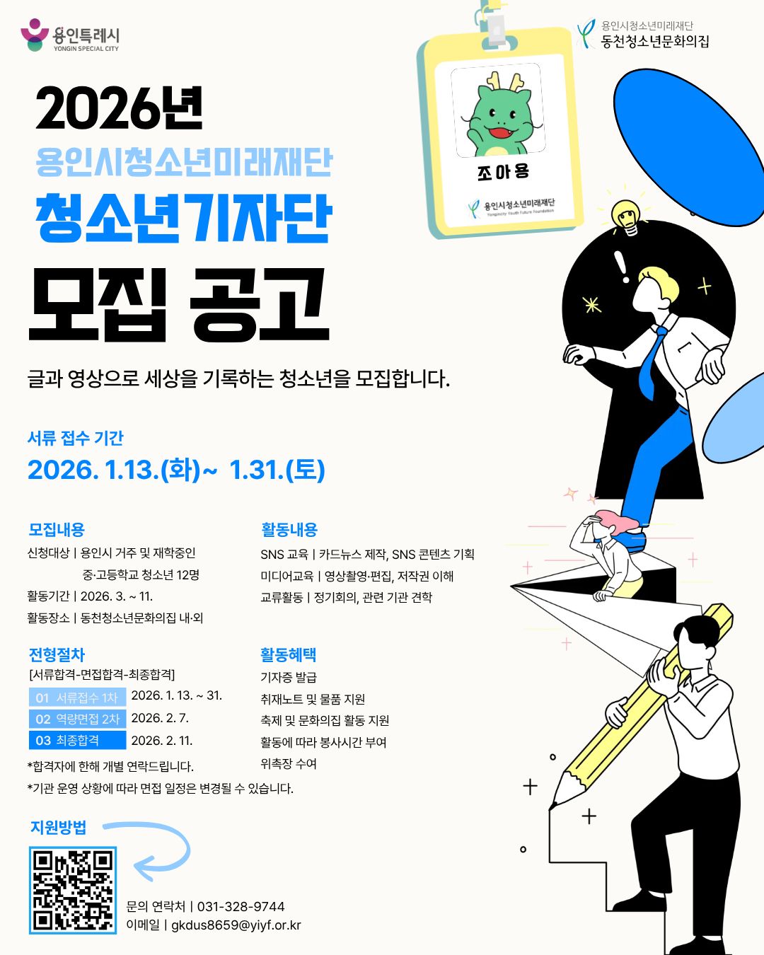 2026년 용인시청소년미래재단 청소년 기자단에서 콘텐츠로 세상을 이야기할 청소년을 기다립니다 ????