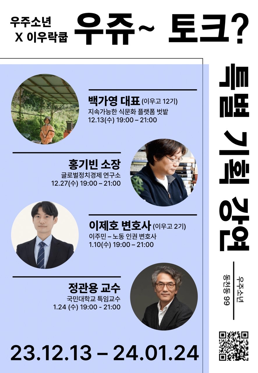 이우락쿱과 우주소년이 함께하는 “우쥬~ 토크”에 초대합니다. 지금 우리가 함께 고민하고 나누어야할 가치들은 무엇일까요? 깊은 고민을 나누어주실 네분과 깊은 겨울밤을 의미있게 보내보세요~ 참여신청은 필수. 아래 링크로! https://docs.google.com/forms/d/e/1FAIpQLSeNRni0tyxV0gRUEc3zAy2-ROLTPtCWf87qZxHo7NI2uX_BNQ/viewform