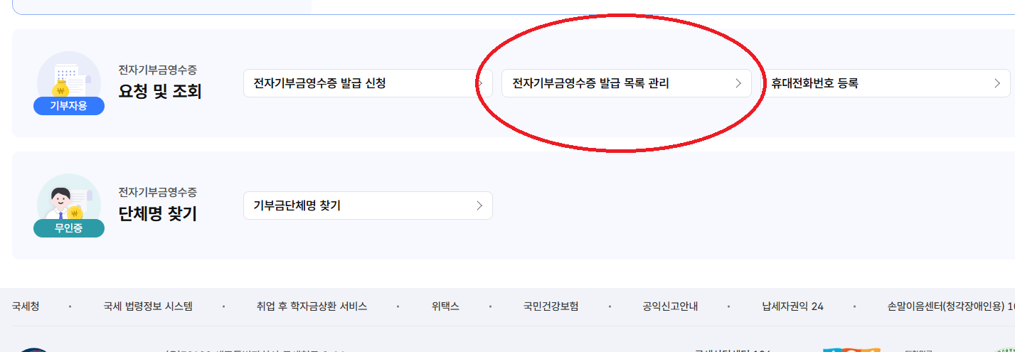 3. <전자기부금영수증 발급 목록 관리> 메뉴를 선택합니다.