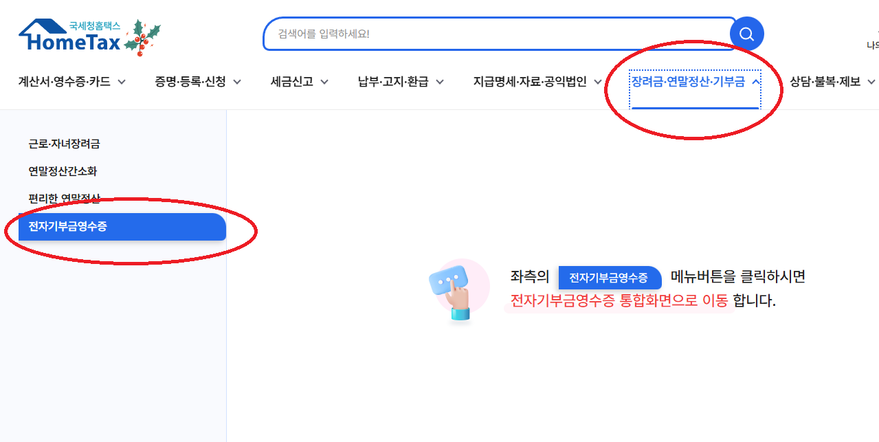 2. 상단의 <장려금·연말정산·기부금> 메뉴를 선택하고, 왼쪽 메뉴 중 <전자기부금영수증> 메뉴를 선택합니다.