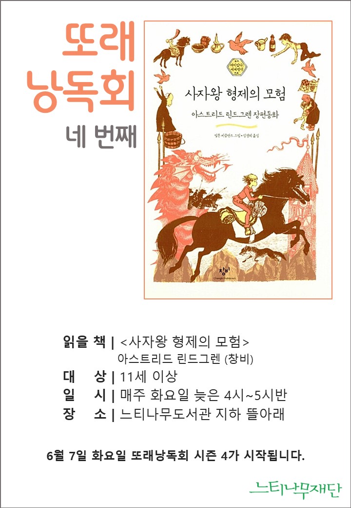 읽을 책 | <사자왕 형제의 모험> 아스트리드 린드그렌 (창비) 대상 | 11세 이상 일시 | 매주 화요일 늦은 4시~5시 반 장소 | 느티나무도서관 지하뜰아래
